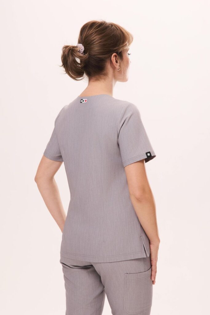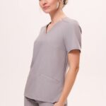 Bluza medyczna FANTASY w kolorze szarym to fantazyjna wersja klasyki. Dekolt z subtelnymi pęknięciami przyciąga uwagę, a ukośne kryte kieszenie z delikatnie widocznym kolorowym akcentem wewnątrz dodają jej niepowtarzalnego charakteru.