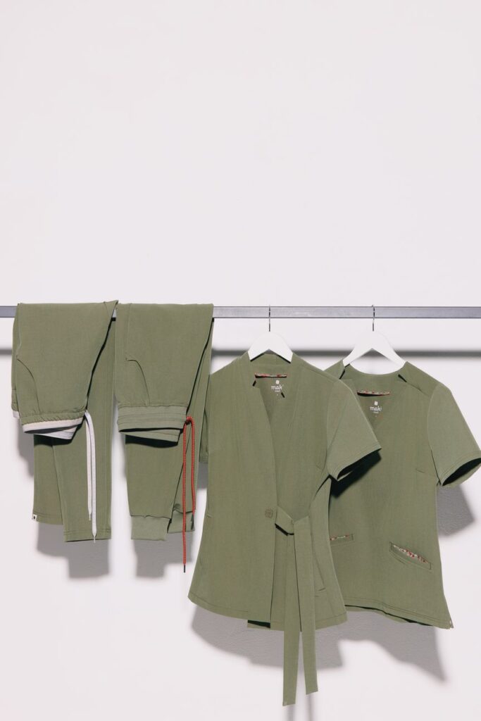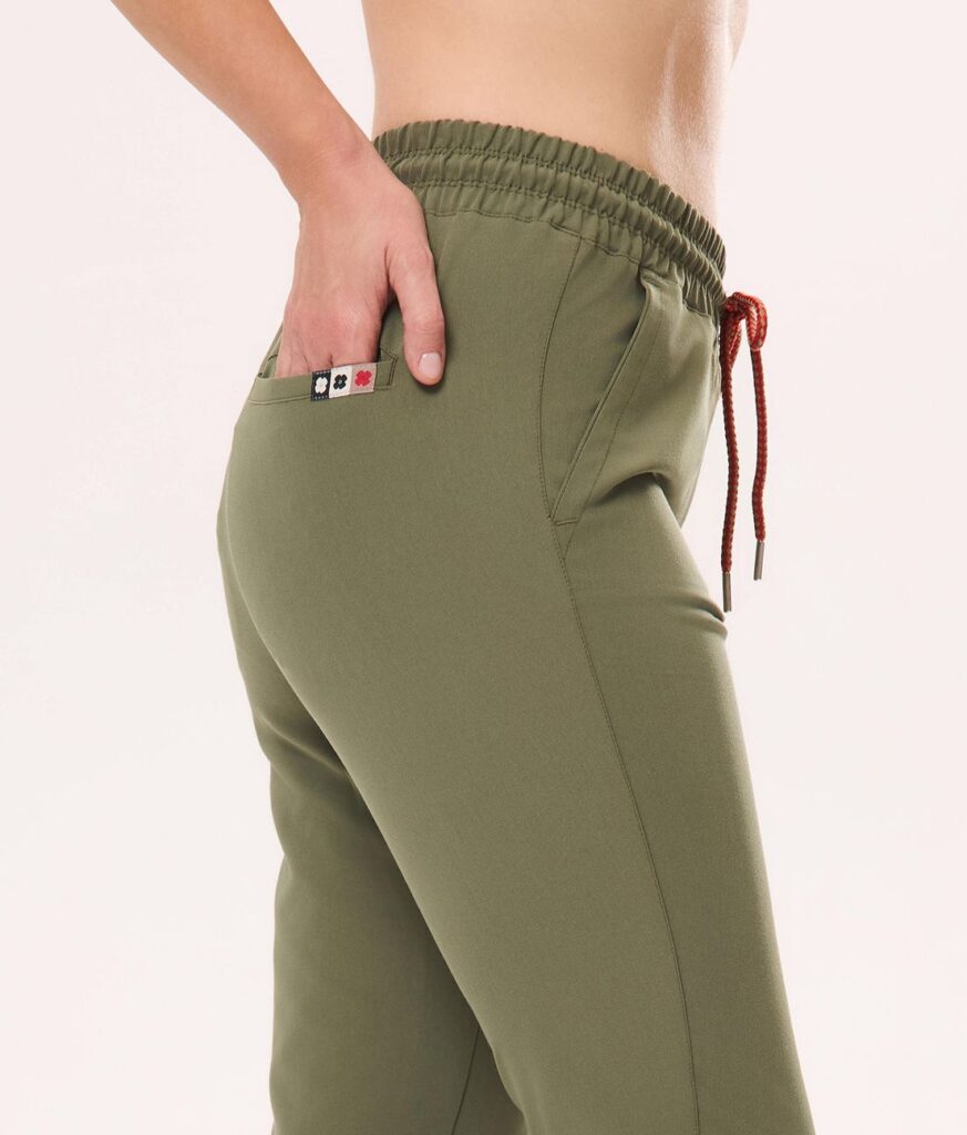 Spodnie medyczne CLOSE FIT w kolorze oliwkowym to nowoczesna propozycja o dopasowanym kroju, która łączy funkcjonalność z modnym wyglądem. Ich zwężające się nogawki, które kończą się tuż nad kostką, tworzą wyjątkowo kobiecą sylwetkę. Miękka, wygodna guma w pasie zapewnia doskonałe dopasowanie i komfort przez cały dzień. Spodnie mają dwie ukośne kieszenie na biodrach oraz dwie kieszenie z tyłu, ozdobione firmowym logo. Dodatkowo, wnętrze pasa zdobi nasz autorski print, który nadaje spodniom wyjątkowy charakter i subtelną elegancję, wyróżniając je spośród innych modeli.
