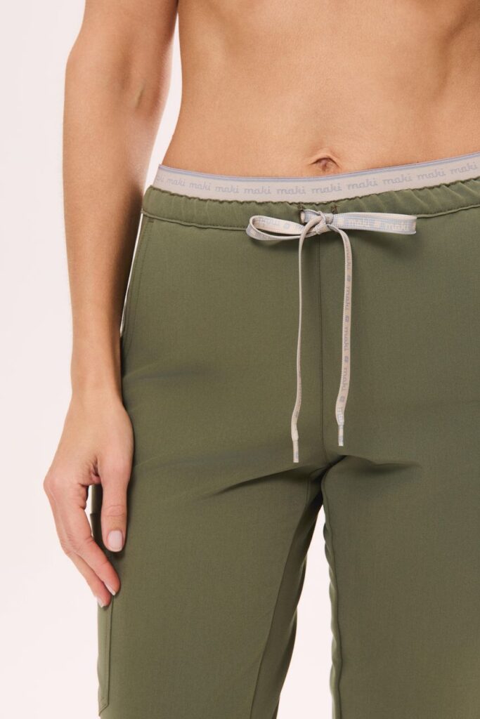 Spodnie medyczne COMFORT w kolorze oliwkowym lekko dopasowane i wygodne z pewnością przypadną Ci do gustu. Prosta nogawka, elastyczna guma z printem MAKI i logowany sznurek w pasie gwarantują idealne dopasowanie i komfort przez cały dzień. Pięć pojemnych kieszeni: dwie ukośne z przodu na biodrach, dwie obszerne z tyłu plus kieszeń na nogawce zapewniają wystarczająco dużo miejsca na wszystkie niezbędne drobiazgi.