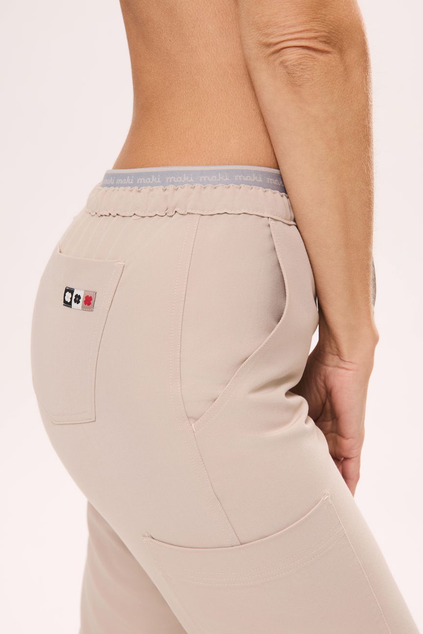 Spodnie medyczne COMFORT w kolorze beżowym lekko dopasowane i wygodne z pewnością przypadną Ci do gustu. Prosta nogawka, elastyczna guma z printem MAKI i logowany sznurek w pasie gwarantują idealne dopasowanie i komfort przez cały dzień. Pięć pojemnych kieszeni: dwie ukośne z przodu na biodrach, dwie obszerne z tyłu plus kieszeń na nogawce zapewniają wystarczająco dużo miejsca na wszystkie niezbędne drobiazgi.