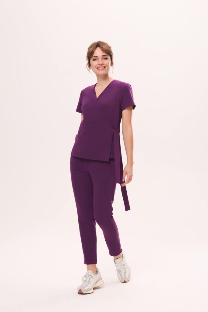 JACKET w odcieniu fioletowym to Tunika medyczna damska o kopertowym kroju, delikatnie dopasowana, wiązana w pasie, świetnie podkreśla sylwetkę, a klasyczny dekolt w serek z ukrytym zapięciem gwarantuje wygodę noszenia.