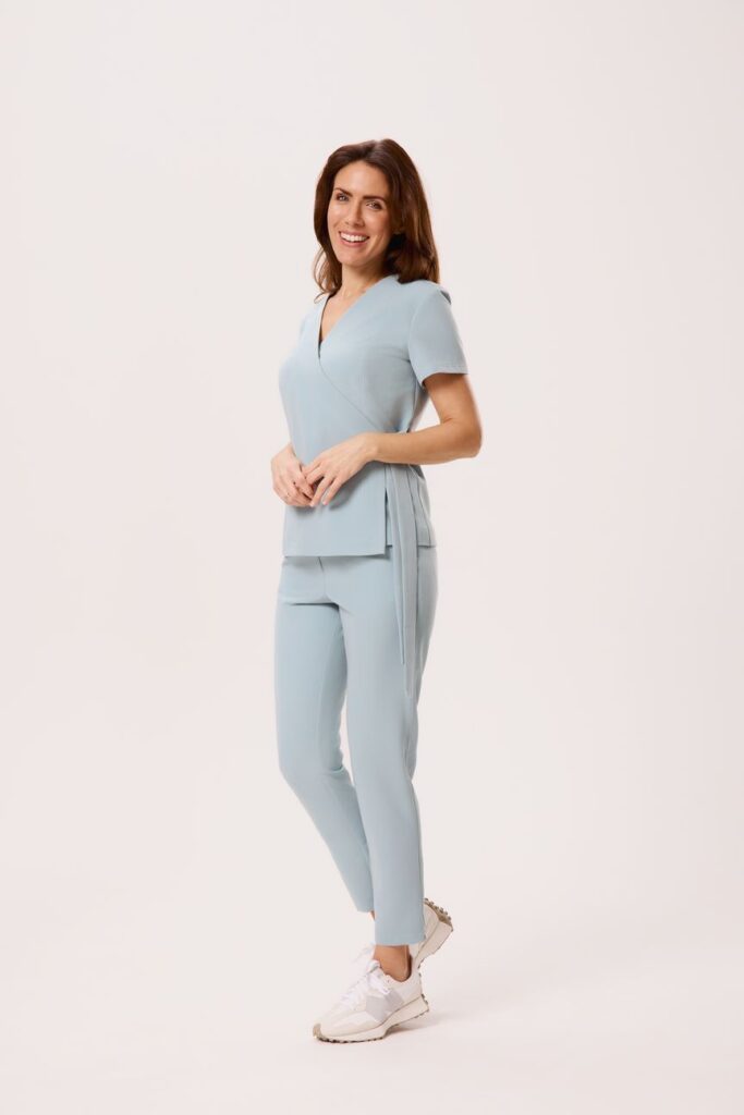 Tunika medyczna JACKET w kolorze szałwiowym to ponadczasowy model łączący elegancję i funkcjonalność. Kopertowy krój marynarki, delikatnie dopasowany i przewiązywany w pasie, podkreśla sylwetkę, zapewniając jednocześnie wygodę. Klasyczny dekolt w serek nadaje jej uniwersalnego charakteru, a ukryta, pojemna kieszeń oferuje praktyczne miejsce na niezbędne drobiazgi.