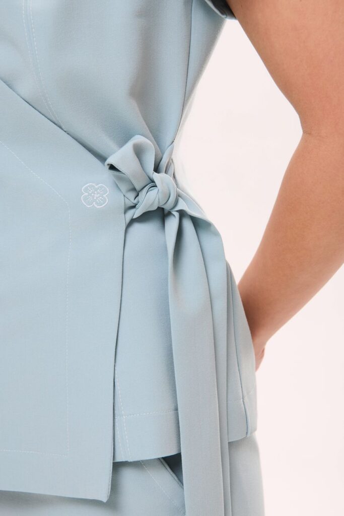 JACKET w odcieniu niebieskim to Tunika medyczna damska o kopertowym kroju, delikatnie dopasowana, wiązana w pasie, świetnie podkreśla sylwetkę, a klasyczny dekolt w serek z ukrytym zapięciem gwarantuje wygodę noszenia.