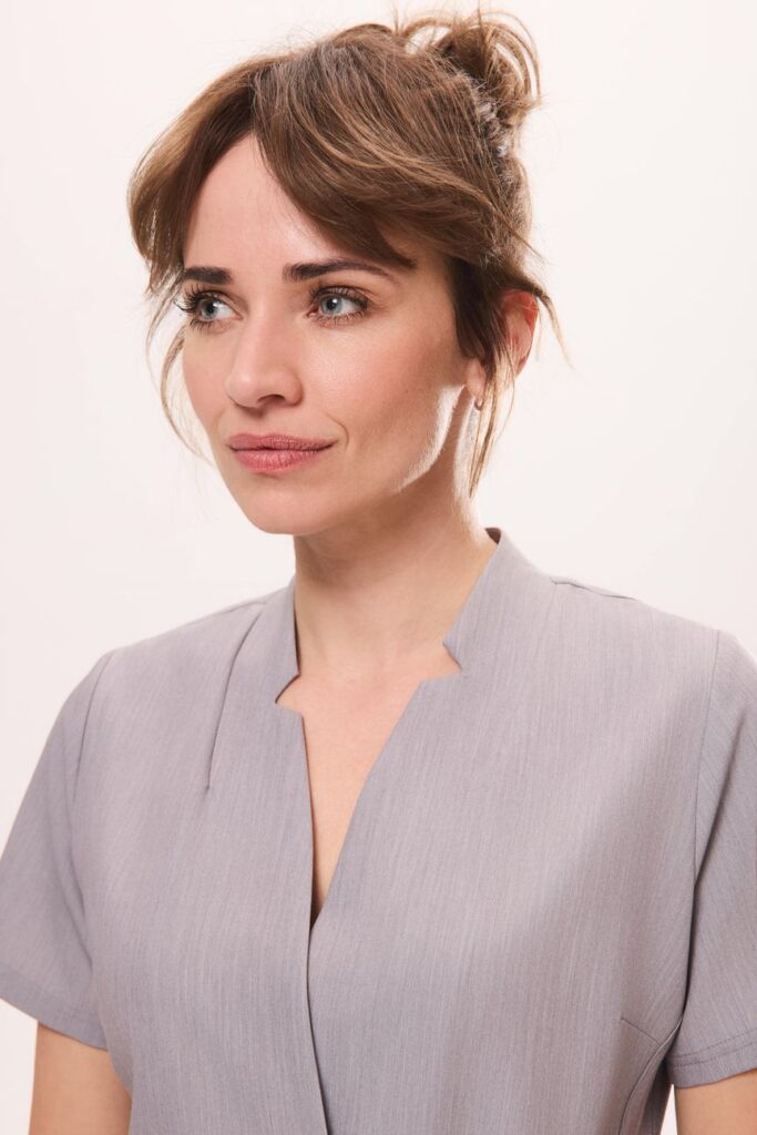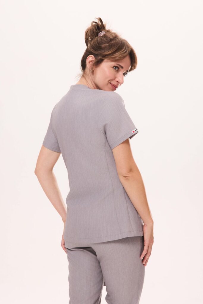 Tunika medyczna OPEN FIT w pięknym szarym odcieniu została zaprojektowana, by perfekcyjnie podkreślać kobiecą sylwetkę. Dzięki regulowanemu wiązaniu, model zapewnia idealne dopasowanie i komfort noszenia. Unikalny dekolt z subtelnymi wycięciami oraz dyskretny haft firmowy nadają jej wyjątkowego charakteru, wyróżniając ją spośród klasycznych fasonów.